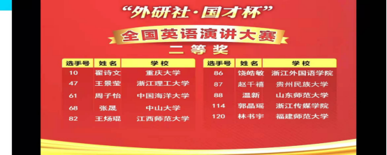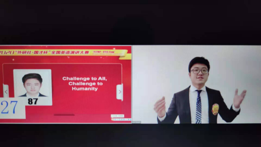 胡静老师指导的文学院2017级戏剧影视文学专业的赵千禧同学在第一阶段演讲中以“Challenge to All, Challenge to Humanity”为题,稳定发挥,以小组赛第二的成绩(89.75分)突围进入15日第二阶段(线上)比赛,成为本次演讲大赛贵州省唯一进入88强的选手,最终荣获全国英语演讲大赛二等奖,再创历史最好成绩!