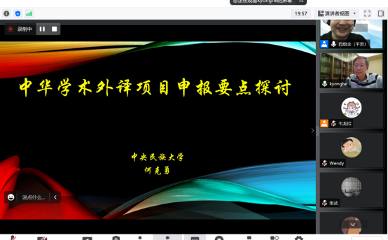 “新知讲坛”,通过腾讯会议线上平台进行了题为“中华学术外译项目申报要点探讨”的报告。本次讲座由女优视频