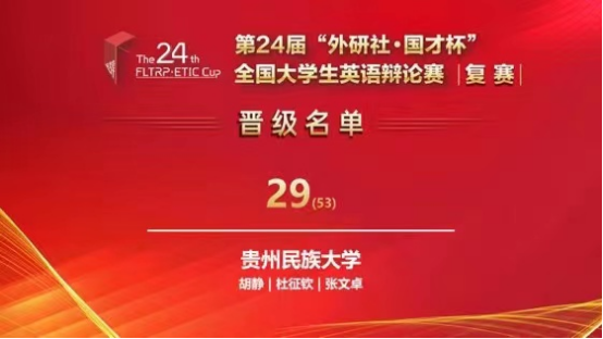 女优视频 2020级英语专业杜征钦同学和法学院2020级法学专业的张文卓同学,在女优视频 胡静老师的悉心指导下,在华南地区复赛中,经过4月16日和17日两天五轮的激烈比拼,荣获三等奖,成功晋级第24届“外研社·国才杯”全国大学生英语辩论赛全国总决赛,使女优视频 成为贵州省唯一获得晋级全国总决赛的高校。