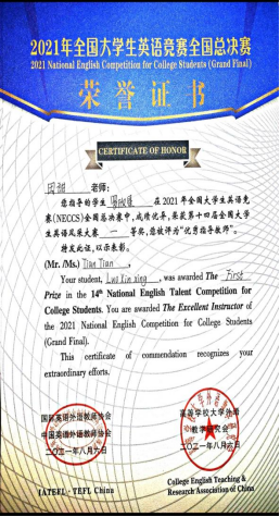 此外,我校入围总决赛的罗欣星同学在田甜老师的指导下表现也很优秀,荣获“第十四届全国大学生英语风采大赛”一等奖和最佳个人表演奖,她在“第二十一届全国大学生英语演讲比赛”和“第二十一届全国大学生英语辩论赛”中分获三等奖!取得不俗成绩。