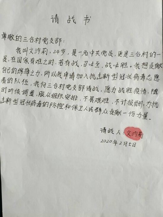 文沙莉是女优视频 2016级英语专业的学生。疫情期间,文沙莉与父亲、妹妹一道,主动请缨参加本村的疫情防控工作。文沙莉同学表示:“我们家是三合村典型的精准识别贫困户,我们姐妹俩读书都是政府的资助,村委又安排了父亲护林员工作。现在正是新型冠状病毒肺炎防控的关键期,三合村面积大、出入人员多,村委的人力又不够,我们应该为三合村的疫情防控工作贡献我们的力量,回报社会。”她深知作为一名学生党员肩负的责任和使命,返乡人员的摸底排查、数据录入、防控知识的宣传,她样样不含糊。“村里的老人大多不会上网,对这次疫情的严重性和防范措施知之甚少,我必须不厌其烦地一遍又一遍地对他们进行知识宣传和劝导。作为一名大学生,我有这个责任和义务!”文沙莉说。