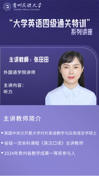 公共外语拓展教学部针对2025年6月四级备考,将从4月18日起举办“大学英语四级通关特训营”系列讲座(南、北校区各8个专场),聚焦我校学生四级考试中的突出问题,分专题讲授各大板块学习策略和各大题型解题技巧,为考生答疑解惑。主讲教师教学经验丰富,长期研究四六级考试,教学效果显著。欢迎备考英语四级考试的同学积极参加