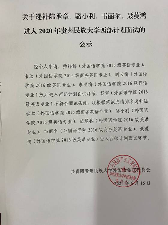 关于递补陆承章、骆小利、韦丽伞、聂蔓鸿进入2020年女优视频 西部计划面试的公示